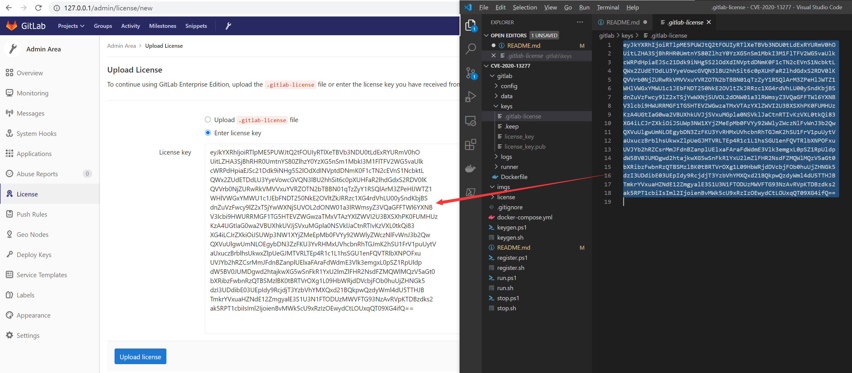 前面生成破解密钥对的时候,已经把公钥写入 Gitlab 容器后台了,还需要把私钥通过前端上传到 Gitlab 完成破解: